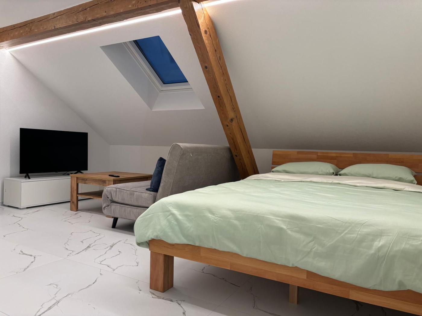 Apartment. This apartment is comprised of 1 living room, 1 separate bedroom and 1 bathroom with a walk-in shower and a hairdryer. Meals can be prepared in the kitchen, which is fitted with a stovetop, a refrigerator, kitchenware and a microwave. The apartment features tiled floors, a seating area with a flat-screen TV, soundproof walls, a tea and coffee maker as well as lake views. The unit offers 2 beds.