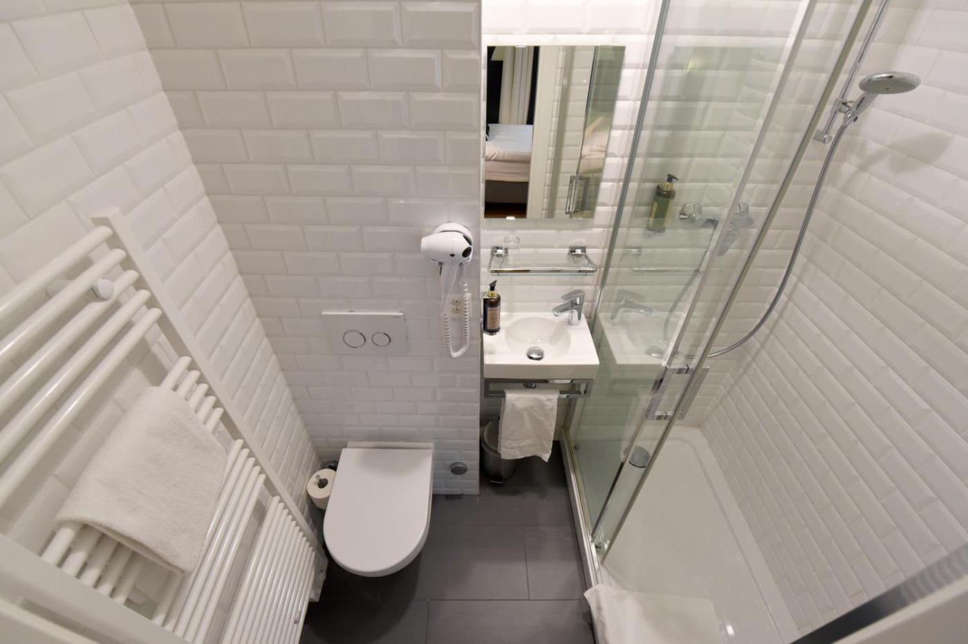 Single Room. Offering views of the street or thecourtyard, this renovated room comes with a cable TV,a coffee machine, a bathroom, air-conditioning, a small refrigerator and a safety deposit box. ;