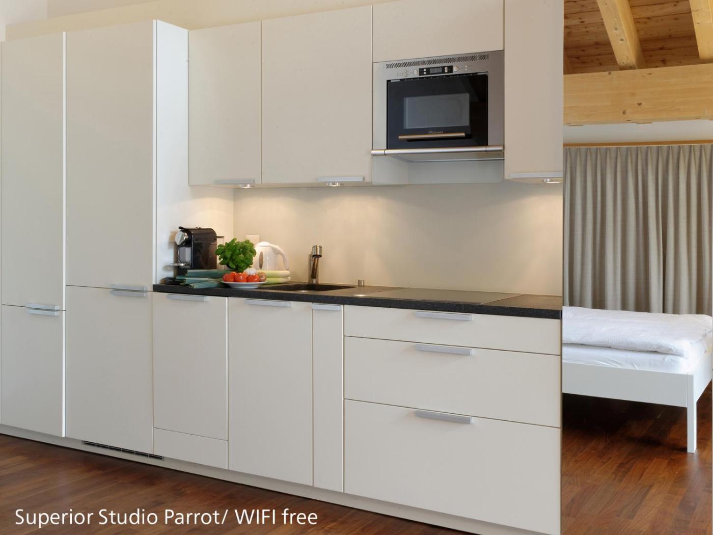 Economy Studio Parrot. Studio overlooking the mountains, with a fully equipped kitchen including a dishwasher and a Nespresso coffee machine, a flat-screen cable TV and a bathroom with a shower cabin.