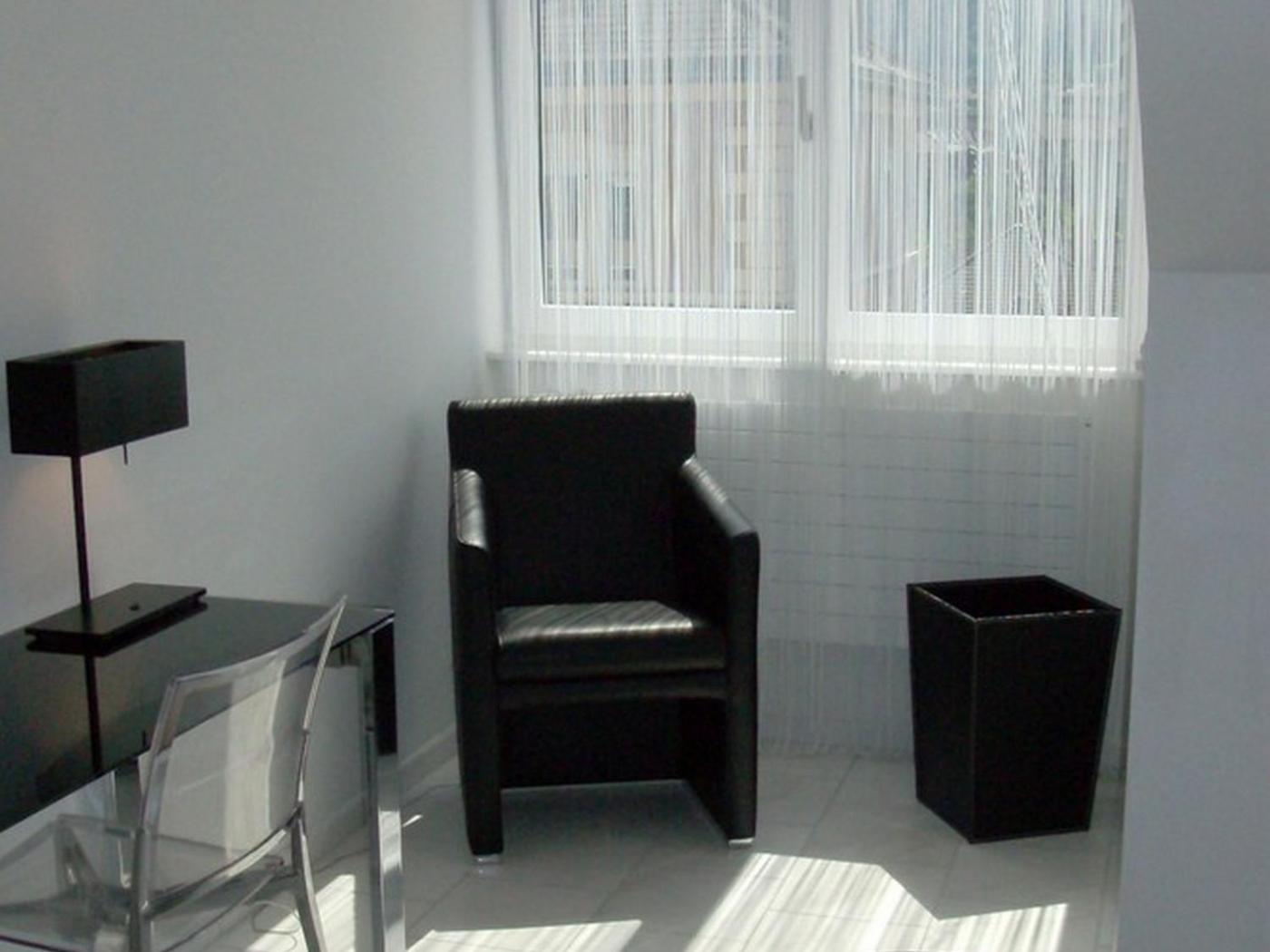 Standard Studio. This modern apartment comes with white, high-gloss furniture. It is fully equipped with a flat-screen TV, a stereo sound system, a bathroom and a kitchen that features a ceramic stove, dishes, pans, a coffee machine and a microwave. ;